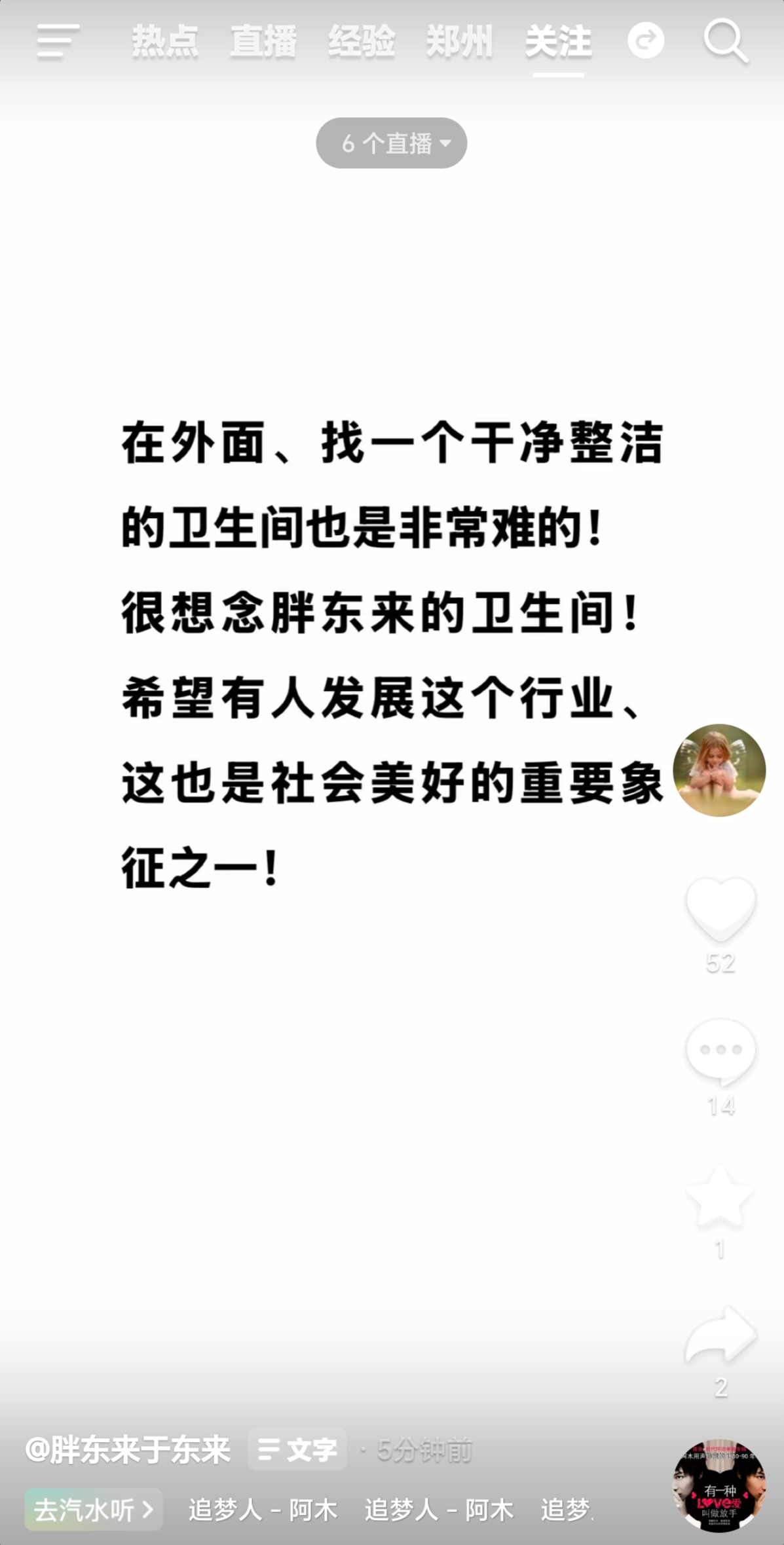 “在外面找個干凈廁所太難了,真想胖東來的衛(wèi)生間!”6月6日,于東來在川藏線旅途中,通過其個人抖音賬號發(fā)出此番感慨。他同時呼吁:“希望有人發(fā)展這個行業(yè),這也是社會美...
