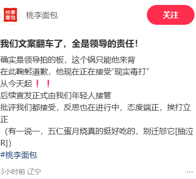 關(guān)于文案“翻車”,桃李面包表示“全是領(lǐng)導(dǎo)的責(zé)任”,并稱“確實是領(lǐng)導(dǎo)拍的板,這個鍋只能他來背,在此鞠躬道歉,他現(xiàn)在正在接受‘現(xiàn)實毒打’。從今天起,后續(xù)宣發(fā)正式由我們...